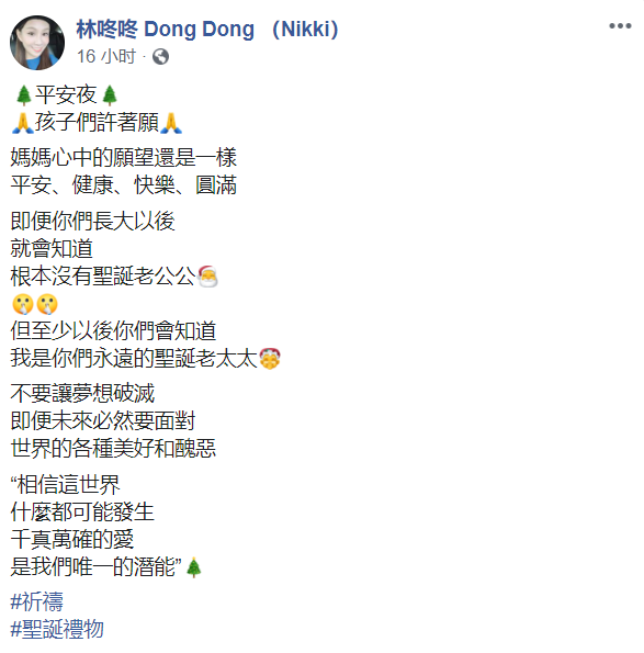 林咚咚还晒出孩子的照片,照片中,孩子们围坐在圣诞树下似乎在许愿,可看似美好的环境里,却没有父亲的陪伴,或许,这对孩子们本身来说,也是一件让人难过的圣诞节吧。