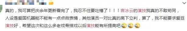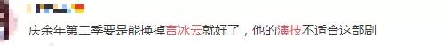 而且言冰云这个角色呈现出来的严肃气氛,和《庆余年》前期整体欢脱幽默氛围也相对割裂,让部分观众感觉融不进去,因此有网友把矛头指向演员肖战,认为是他演技的锅。甚至有人还建议第二季言冰云应该换人出演。