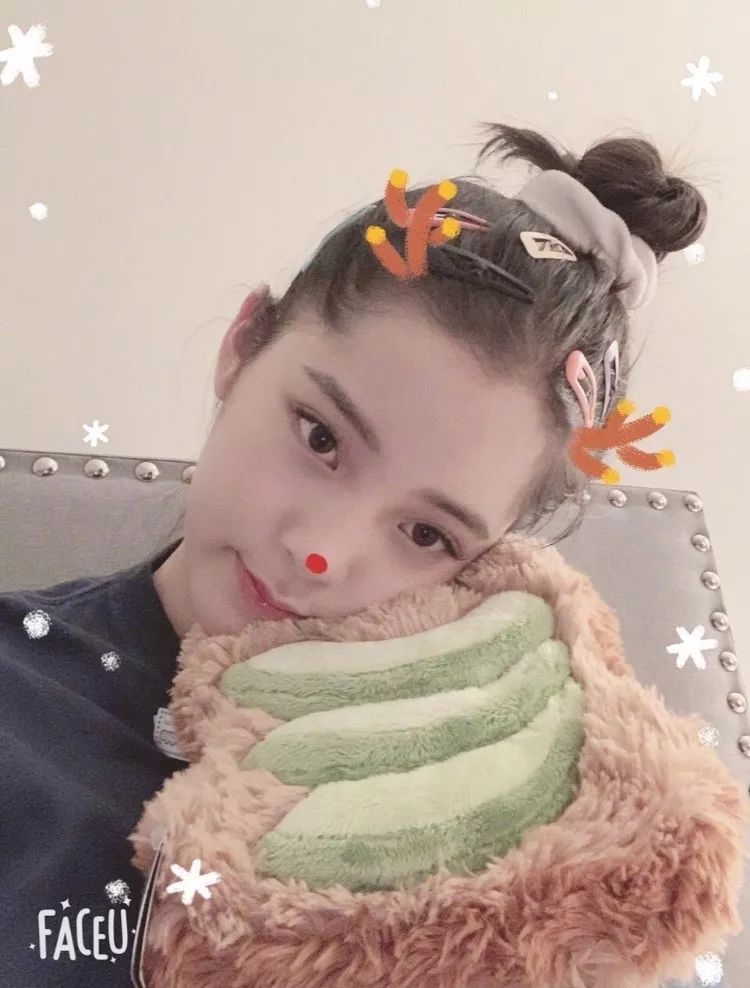 欧阳娜娜的圣诞也是小女生的自拍角度,绑着丸子头,靠着毛茸茸的暖水袋上,像极了在家自拍的自己。