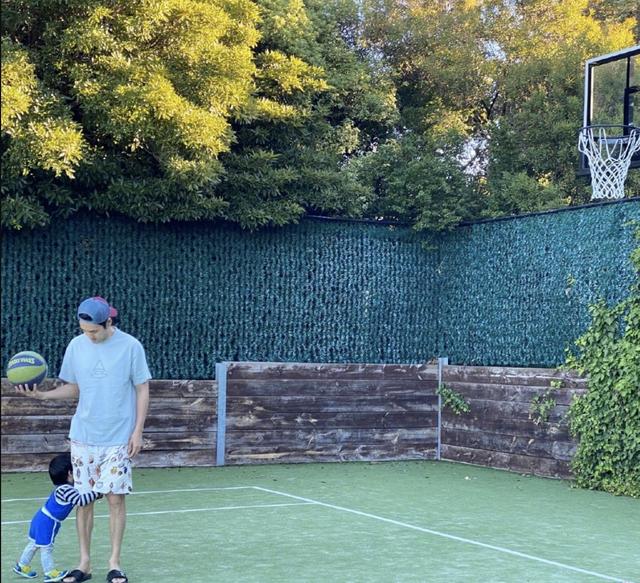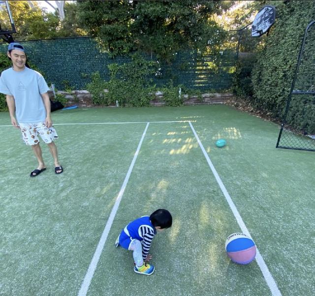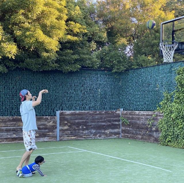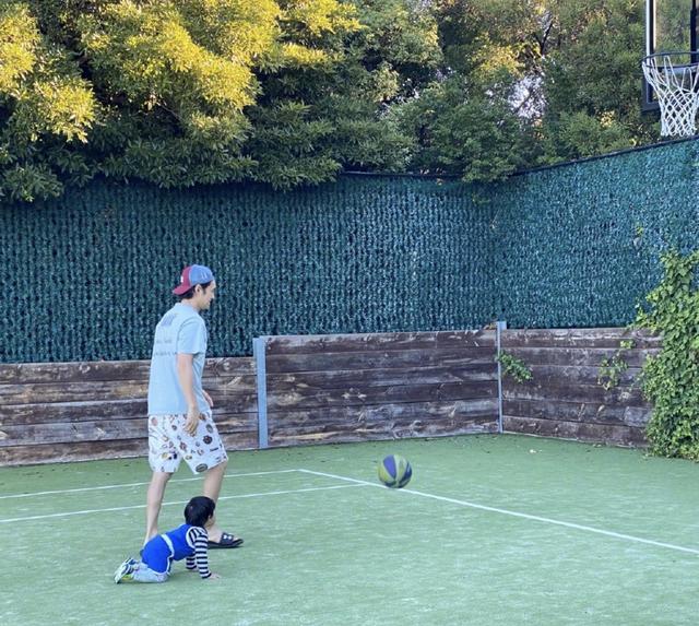 袁弘丝毫没有想要把球给儿子玩的意思,光顾着自己投篮耍酷了。