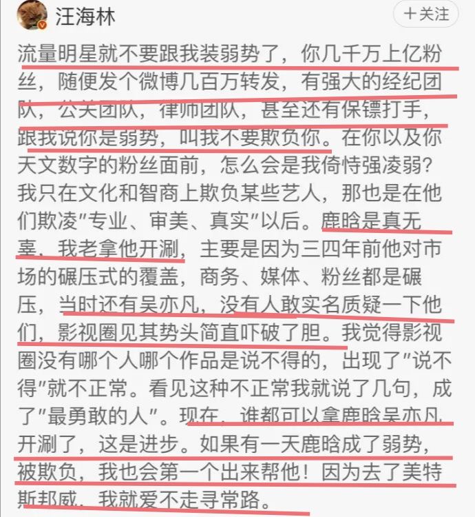 说让流量明星不要在他面前装弱势了,他们有经纪团队、公关团队、律师团队甚至还有打手,在天文数字的粉丝面前自己根本算不上恃强凌弱。
