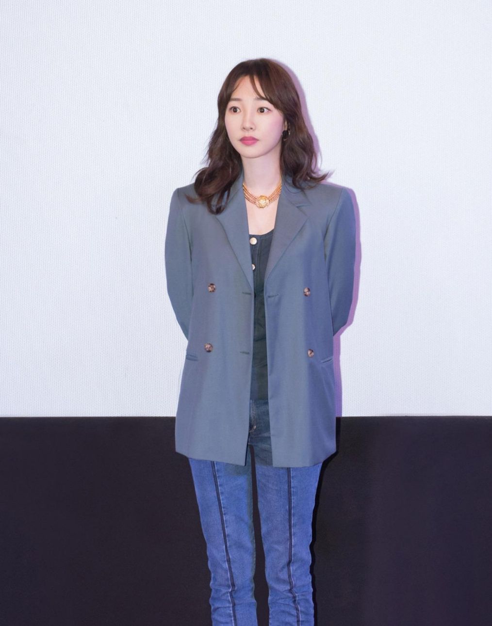 当天,白百何身穿灰色西装外套,搭配紧身牛仔裤,脚踩尖头高跟鞋,整体来讲有点不搭调。特别是牛仔裤,太显腿粗,跟她以前纤细的筷子腿比,胖了好几圈。