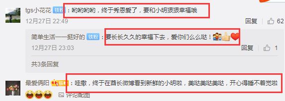 两人感情备受关注,自然也引起了一些网友的热议。一些网友说道,“终于看到明姐辽,明姐变美了,夸你养的好”、“这狗粮,啃了”、“终于秀恩爱了,要和小明狠狠幸福哦”,网友们送上自己的满满祝福,希望两人一直幸福下去。能得到大多数人的祝福,相信两人会获得幸福婚姻。