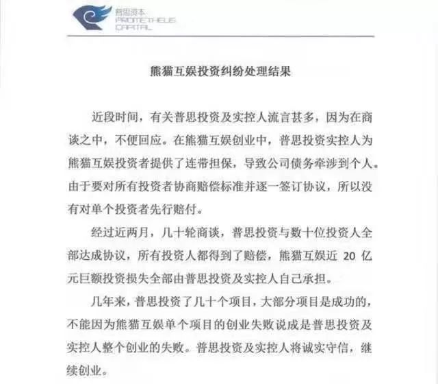 12月26日,普思资本对外发布公告,称经过近两月数十轮的商谈,普思投资与熊猫互娱数十位投资人全部达成协议。所有投资人都得到赔偿,熊猫互娱近20亿元巨额投资损失全部由普思投资及实控人自己承担。同时,普思资本还表示,普思资本所投资的大部分项目是成功的,不能因为单个项目创业失败就说成是普思资本及实控人整个创业失败。普思投资及实控人将诚实守信,继续创业。然而,熊猫互娱投资人否认已获王思聪赔偿。表示未参加谈判,会继续追究。