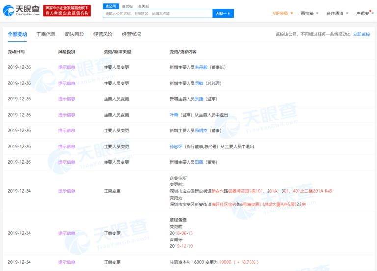 12月26日,据天眼查数据显示,深圳市腾讯视频文化传播有限公司发生工商变更,腾讯公司副总裁兼企鹅影视CEO孙忠怀退出法定代表人和总经理、执行董事,新增洪丹毅为法定代表人和董事长。此外,监事叶青退出,新増闫敏为总经理,张捷为监事,冯明杰、田丽为董事。公司的注册资本也由1.6亿人民币增至1.9亿人民币,增幅达1875%。对此,腾讯视频方面回应称,这是工商信息的正常变更,与人事变动无关。