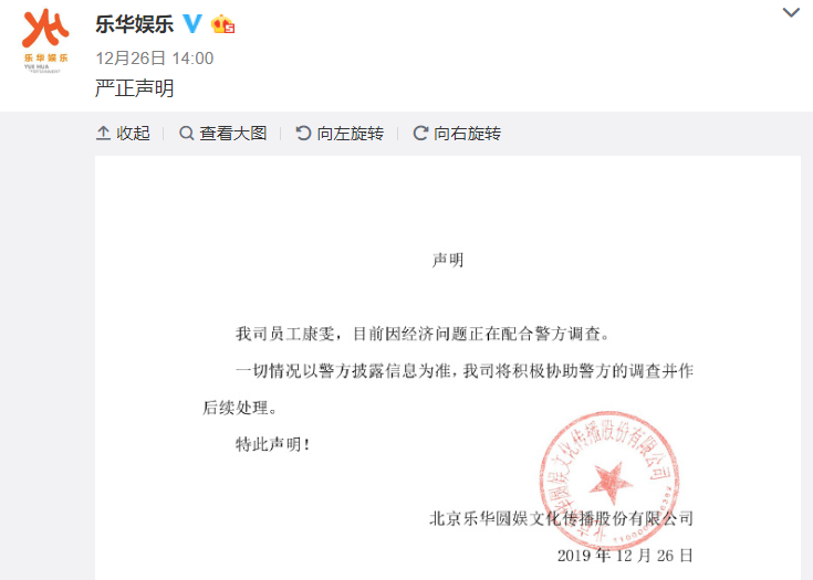 12月26日,网传王一博所在经济公司乐华娱乐的老板杜华,举报了王一博经纪人康雯贪污。随后,乐华娱乐发布声明,表示康雯目前因经济原因,正在配合调查。