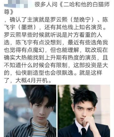 今天有不少媒体都爆出罗云熙要搭档陈飞宇合作某耽m剧的消息,但粉丝却并不认可,表示“溜粉不约”。
