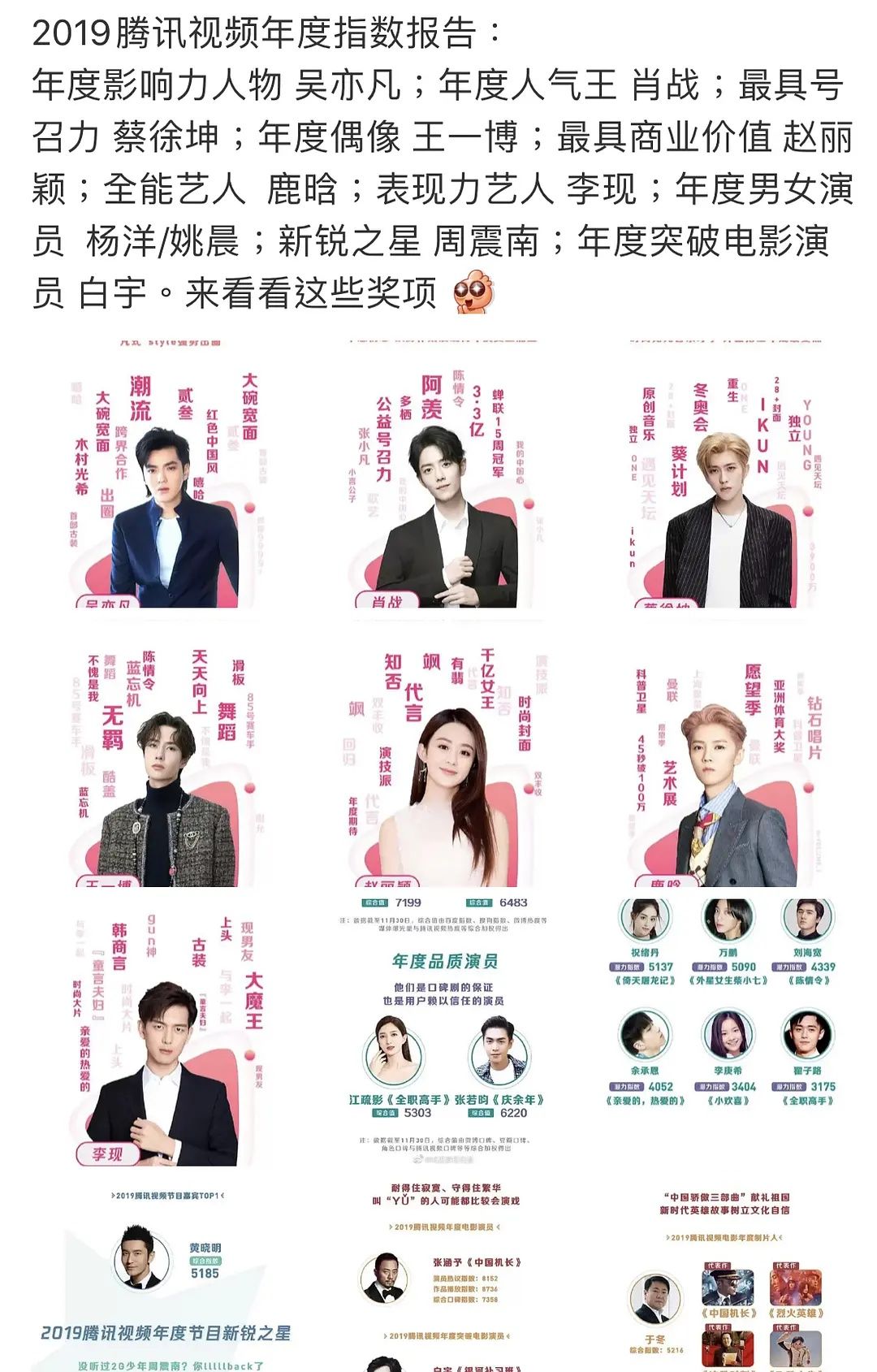 说到这个,今天腾讯星光大赏部分奖项已经出来了,吴亦凡得了个年度影响力人物,有豆瓣网友爆出的部分获奖名单。