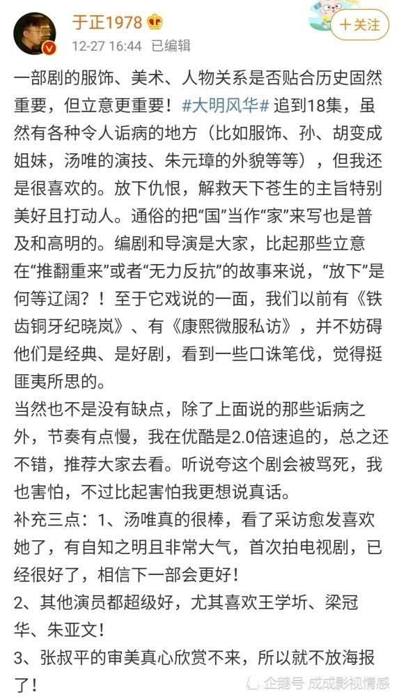 于正也算是古装题材最擅长的业内人士之一,今天,他发文评价了正在热播的古装剧《大明风华》。