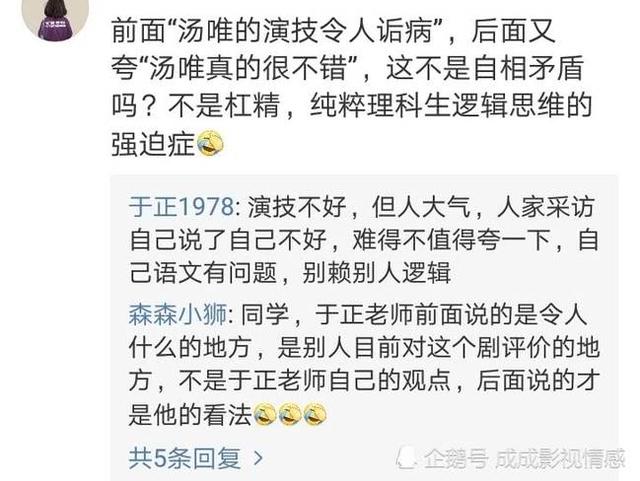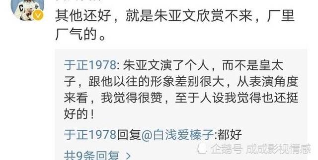 有关朱亚文厂里厂气的风评以及汤唯的演技争议,看看于正在评论区的回复。