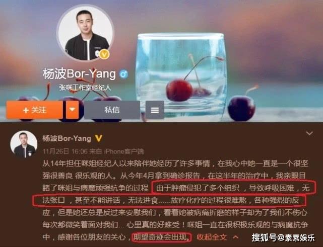 就连她的经纪人杨波当时也表示咪姐的病情不稳定,而且已经到了无法进食的地步。