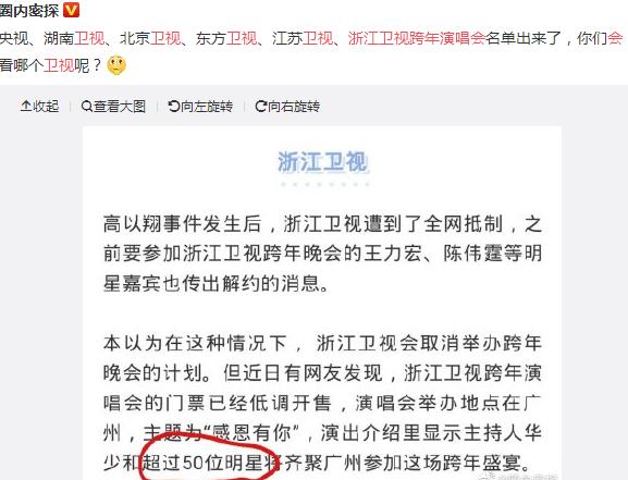 微博上的某位圈内人曾放豪言说,浙江卫视的跨年演唱会收视率会创新低。热心网友们都在全面抵制,造成这个局面也是可想而知的。很多明星的粉丝表示爱豆是无辜的,公司帮接的业务没得选,如果可以选绝对不会去浙江台跨年。骂浙江台可以,谴责浙江台也可以,但是不要伤害到无辜的明星,网友的三观还是挺正确的。