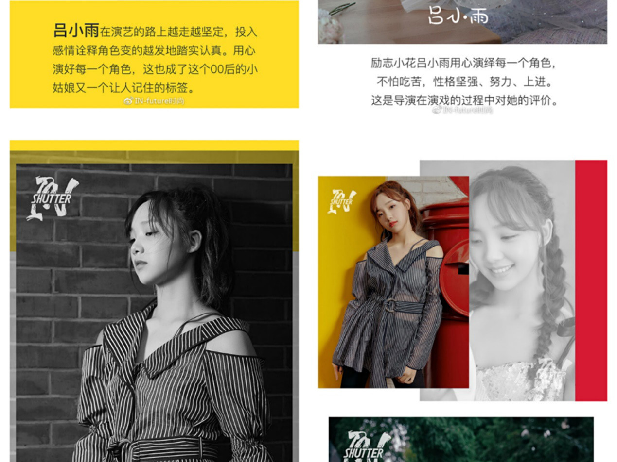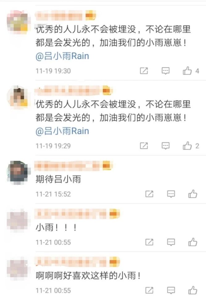 翻看她的微博,属于少女的可爱和真实一点一点被生动的描绘出来。生活中的吕小雨就像是一个邻家女孩,笑起来像小天使一样,很暖很贴心。粉丝们亲切的称呼小雨为“崽崽”,对她最多的评价就是“努力的人不会被淹没”。