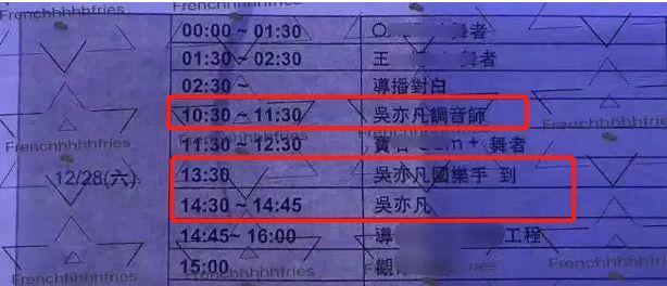 没想到,网友却从流程图中发现了一些趣事,作为歌手的吴亦凡除了自己彩排外,其调音师也需要参与彩排,而让人费解的是,作为主唱的吴亦凡只需要彩排15分钟,而吴亦凡的调音师却整整有一个小时的彩排时间,两人之间主次完全颠倒。