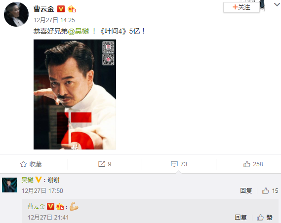 值得一提的是,吴樾的诸多好友都为这部戏做宣传。在电影《叶问4》票房破5亿时,圈内不少明星纷纷向大家推荐这部电影。如相声演员郭德纲就转发吴樾微博,还称都来看看呗,也是很难得。