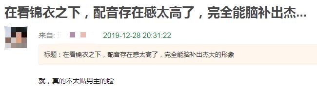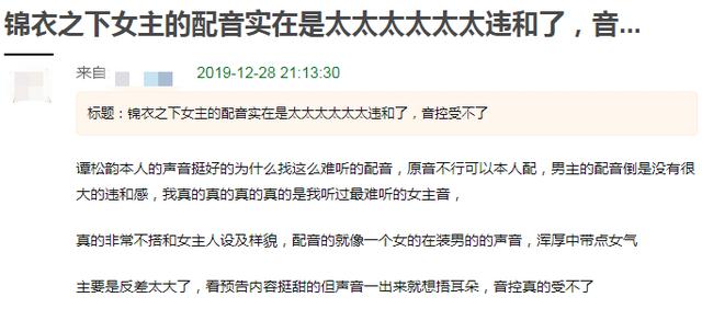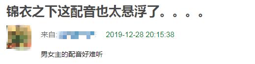 不知道为什么,这部剧采用了配音。不论男主还是女主,都被网友吐槽配音太过“悬浮”,不贴脸,声音和人物样貌太“违和”。