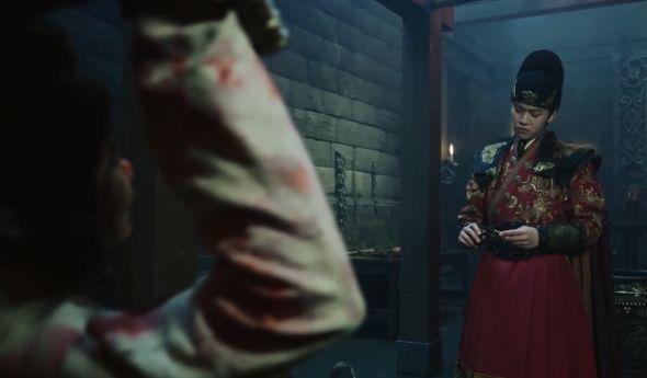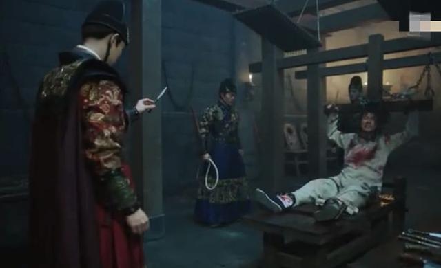 然后一言不合,犯人的两只脚也都被扎上了刀,一把也没浪费。犯人痛晕过去,男主也毫无怜悯,一瓢冷水泼过去。这冷酷残暴的表情真让人怀疑男主会谈恋爱么?不过,一个性情狠辣的锦衣卫形象就呼之欲出了。