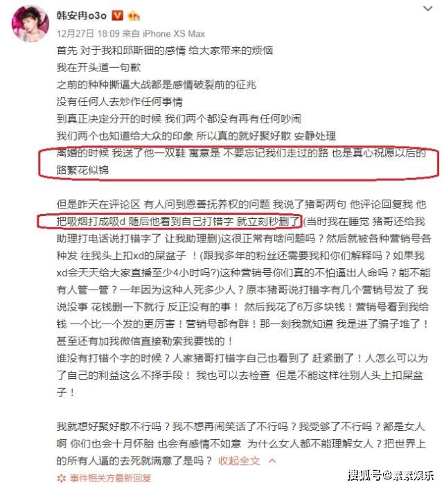 不过韩安冉再一次的更新要长文来解释了此事,而且否认了事情的真实性。表示老公只是打错了字,他只是想要把吸Y打成了D而已,所以让大家都误会了。
