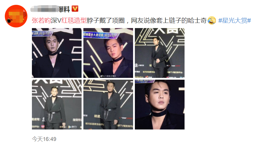 星光大赏他更是走心过头,原本细致男孩,张若昀硬生生地把自己穿成了妖艳男神。本身穿着并没太多吐槽,但张若昀脖子上的装饰实在太惹眼: