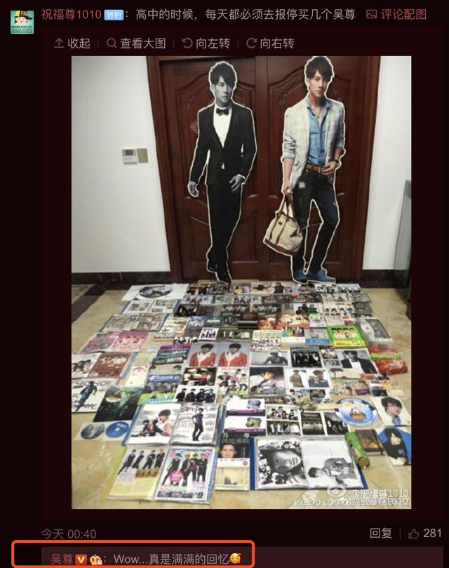 热评第一条是一位吴尊的真爱粉,她晒出了一张配图,家里摆满了吴尊的海报、杂志,十分自豪地表示:高中的时候,每天都必须去报亭买几个吴尊!