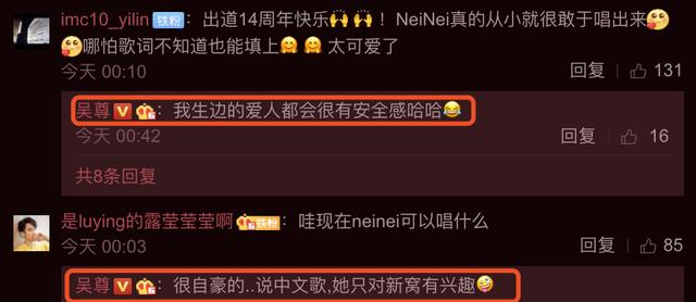 网友调侃NeiNei很敢唱,哪怕歌词不知道也能自己填上。吴尊笑称那是因为自己给了他们安全感。