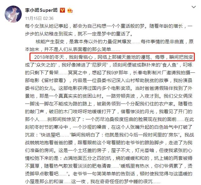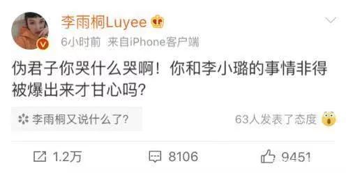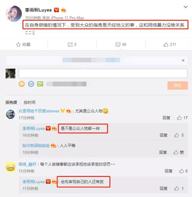 11月20日,李雨桐在微博发文表示:“在自身做错的情况下,受到大众的指责是天经地义的事儿,这和网络暴力没有什么关系”。这一段模棱两可的话让网友们都感到非常奇怪,无风不起浪,李雨桐说这一番话似乎是别有用意。