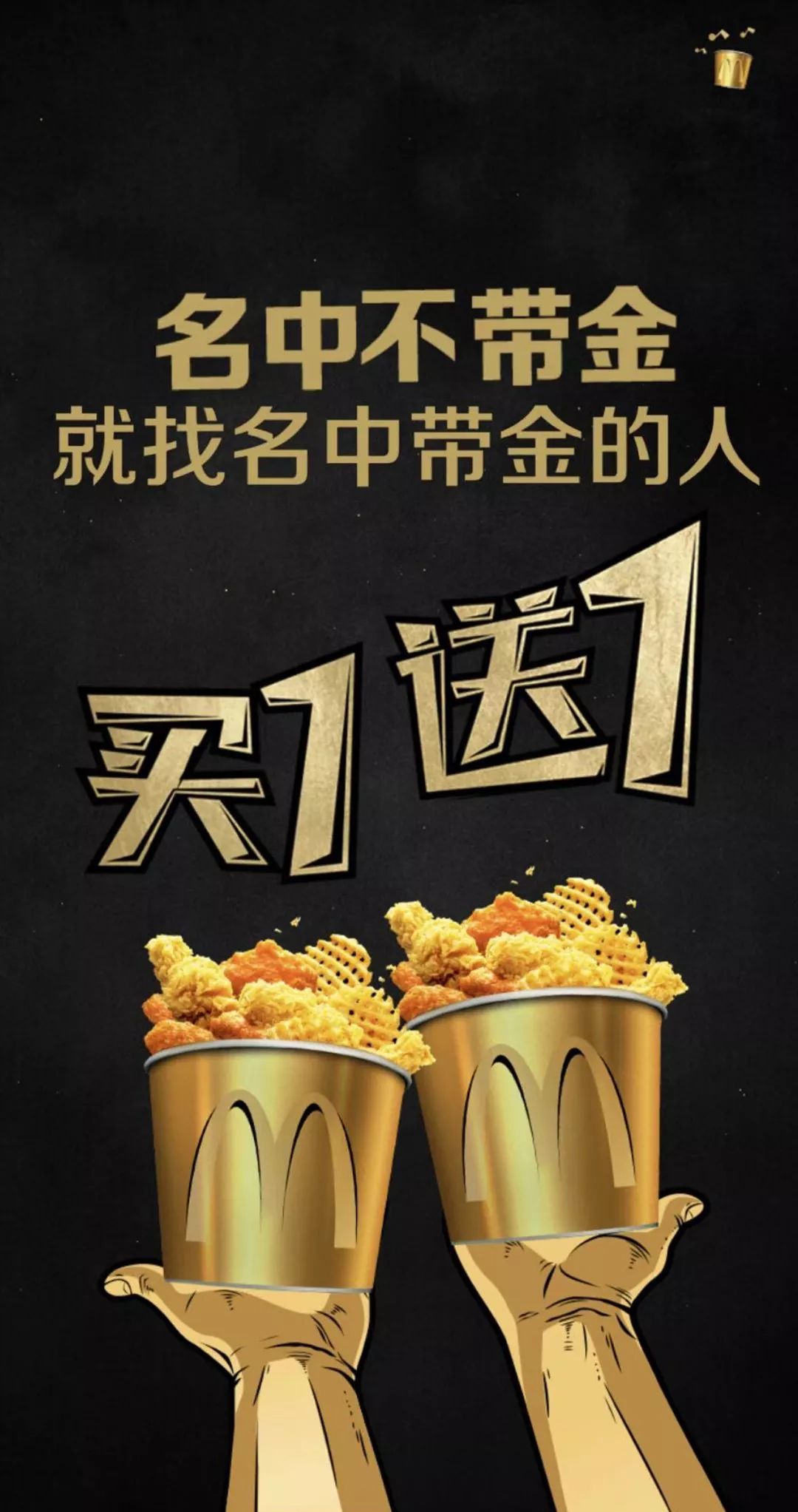 只要你名字中带“金”字或金字偏旁,就可以买一送一!不带也没关系,找到你身边那位“名中带金”的朋友,拉上ta去麦当劳,照样可以享受买一送一的福利!