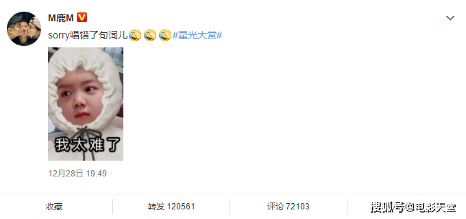 不过演出结束后不久,鹿晗却发文表示刚刚演唱过程中唱错了一句歌词,他也配上了一张宝宝特效表情包表示“我太难了”。相关话题“鹿晗sorry唱错了句词”也很快登上微博热搜,并一路冲上了榜首。