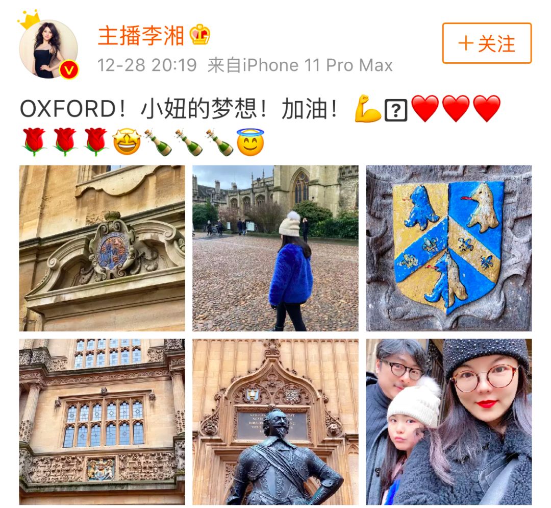 昨天,李湘在微博晒出一家三口在英国游玩的照片。照片中,李湘戴毛线帽,涂红唇,戴着眼镜,身穿黑色羊毛大衣站在最前面,王诗龄头戴白色毛线帽,站在妈妈和爸爸中间,王岳伦则将脸轻轻贴在女儿头部。李湘还在文中透露,女儿王诗龄的梦想是考牛津大学。