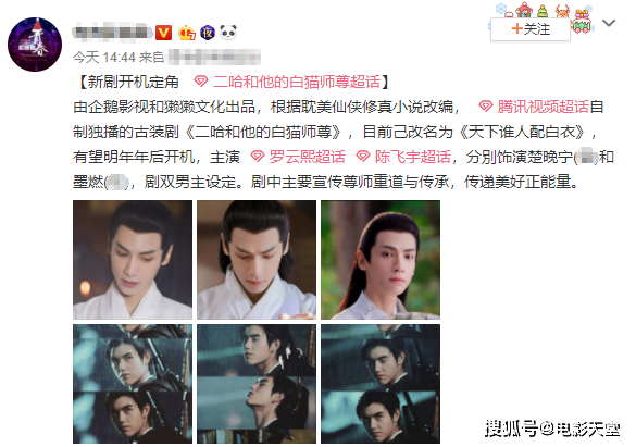 今天,有知名博主爆料鹅厂又在筹备新的古装玄幻双男主剧:《天下谁人配白衣》,据悉该剧改编自作家肉包不吃肉的长篇小说《二哈和他的白猫师尊》,初定的两个男主角分别是罗云熙和陈飞宇。