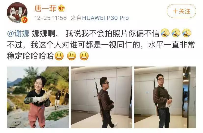 “娜娜啊, 我说我不会拍照片你偏不信。不过,我这个人对谁可都是一视同仁的,水平一直非常稳定哈哈哈哈。” 微博上,唐一菲调侃起了自己的拍照技术。