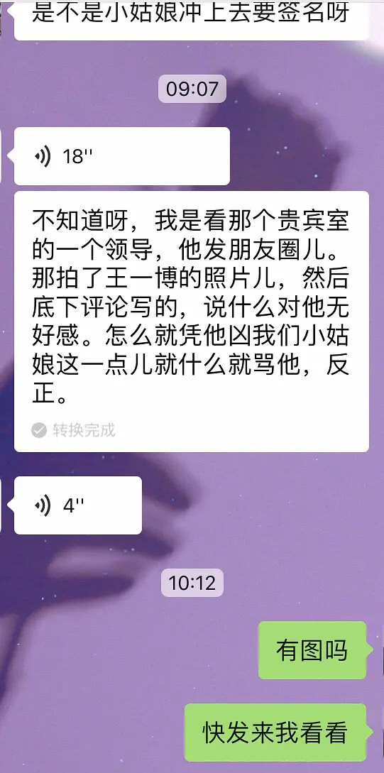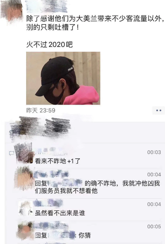 尽管该工作人员的朋友圈只拍了一个侧影,但从王一博29号前往海口参加卫视跨年彩排的行程和装扮来看,前后也是完全吻合的。而该网友晒出的截图对话中,也看到王一博被指不仅在贵宾室耍大牌,更是无理由的凶女服务人员。而王一博的这一“耍大牌”的操作,也引发了网友的疯狂diss,开启了新一轮的嘲讽。