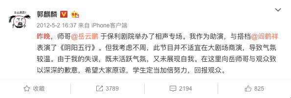 2012年,郭麒麟开始登台,在一次表演中,他表现的很差,但秉承父亲教育的他,下场就给观众道歉,并且发微博,态度很是诚恳。