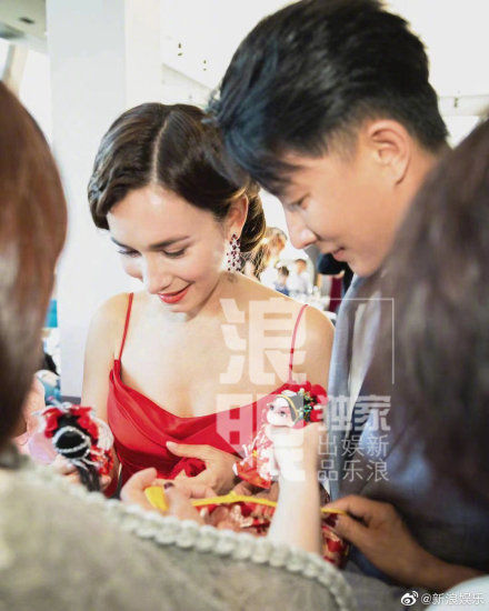 12月30日,亲友曝光韩庚卢靖姗婚礼欢迎晚宴的照片,韩庚身穿灰色西服,卢靖姗着红色长裙性感美艳,两新人灿笑与友人交谈。