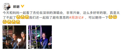 12月30日,周杰伦深圳演唱会开唱,郎朗带妈妈现身周杰伦演唱会,并通过微博晒和妈妈在现场的照片,配文写道:“今天和妈妈一起看了杰伦的演唱会,非常兴奋,这么多好听的歌,真是太了不起了!”还透露称:“我们还一起拍了超有意思的《周游记》,可以期待一下!”