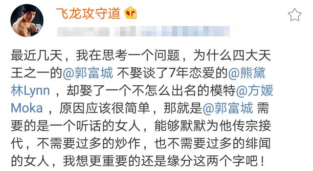 飞龙表示:“最近几天,我在思考一个问题,为什么四大天王之一的郭富城不娶谈了7年恋爱的熊黛林,却娶了一个不怎么出名的模特方媛,原因应该很简单,那就是郭富城需要的是一个听话的女人,能够默默为他传宗接代,不需要过多的炒作,也不需要过多的绯闻的女人,我想更重要的还是缘分这两个字吧!”