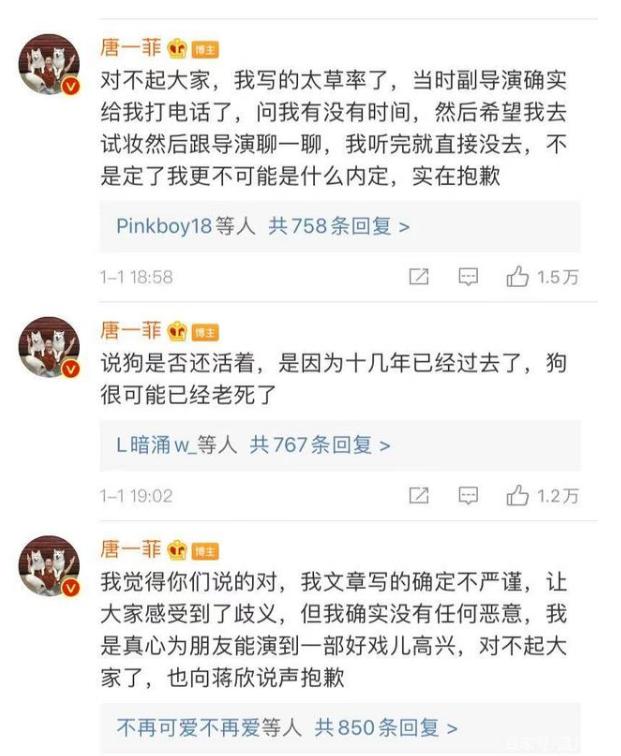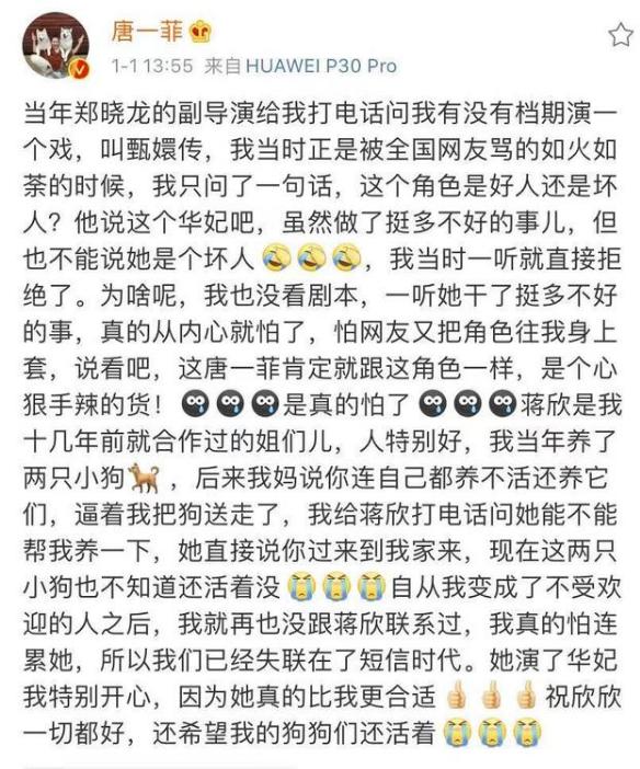 但是唐一菲很快暴露了开微博炒作的动机不说,还暴露了自己的情商智商不高的缺点。因为最近她在微博爆料,一会说《甄嬛传》在线观看(✪ω✪)剧组找她演华妃这个角色,一听是坏角色就拒绝了,一会说把狗给了演华妃的蒋欣,后面却失联了。或许唐一菲只是想简单爆料蹭下电视剧和其他明星的热度,谁知道表达不妥,传达了不该有的信息误导大家,觉得好像华妃这个角色本来是她演一样,如果她不拒绝仿佛就和蒋欣没关系了,但其实当时也只是咨询,压根没轮到她见郑小龙。另一方面,她和蒋欣失联十年,惦记狗的事却没直接联系,又在微博爆料,感觉好像蒋欣还做得不对一样,这样一来蒋欣也躺枪了。