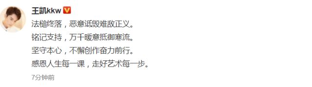 胜诉之后王凯在社交平台上发文写道:“法槌终落,恶意诋毁难敌正义。铭记支持,万千暖意抵御寒流。坚守本心,不懈创作奋力前行。感恩人生每一课,走好艺术每一步。 ”获得了网友们的支持,王凯用行动证明了自己。