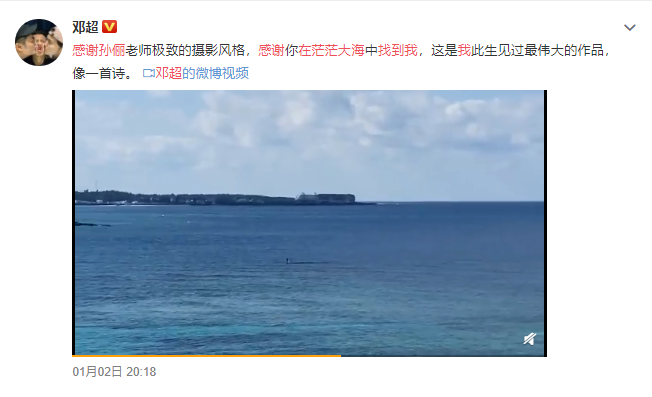 邓超晒视频发文:“感谢孙俪老师极致的摄影风格,感谢你在茫茫大海中找到我,这是我此生见过最伟大的作品,像一首诗。”夸赞孙俪摄影技术,而孙俪也现身评论区,表示自己“太难了”,这波狗粮比兄弟鹿晗的来的稍晚一些,不过也是管饱呀!老实说,小编在刚看到这个tag的时候,还以为超哥说的大海是人生,原来是真的大海,真的是在茫茫大海里找到他在海上的一个小点点,这恩爱真秀!哈哈哈,娘娘能找到这个点也是不容易了!