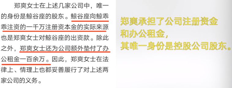 声明最后还提到,郑爽作为控股股东,本来没有义务履行对鲸谷座和鲸乖乖的义务,但是在向鲸乖乖出资1000万注册资本金的基础上,又额外垫付了办公租金一百余万。