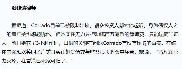 此后孟广美对男友起了疑心,而到孟广美想向男友追回钱财时,她才发现 Corrado还遭到多名投资人起诉追债,被追讨近5亿人民币。