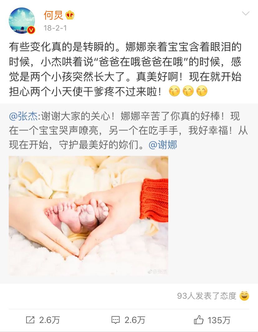 还有一次,在谢娜产后回归快本之前,她发布一条微博“有一种胖叫预告胖”,这是谢娜提前让大家为她的“发福”做一个心理准备。而在评论区,何老师暖心回应“有一种爱,叫回归爱”。
