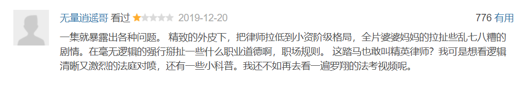 观众们对《精英律师》吐槽的另一个方面则主要集中于浮夸的剧情与人物,其中以靳东尤甚。