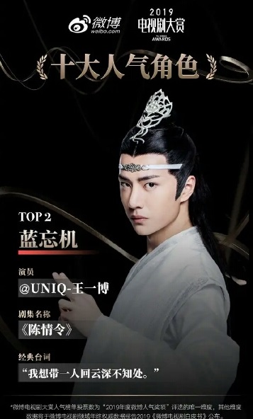 排在第二位的角色就是《陈情令》当中的蓝忘机,这个角色的饰演者就是王一博,蓝忘机的经典台词就是“我想带一个人回云深不知处”