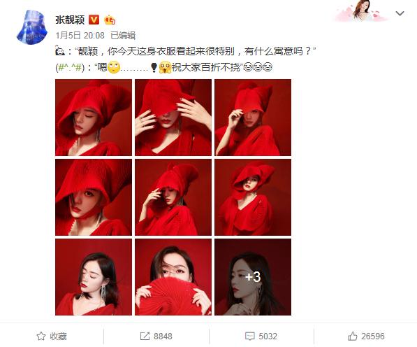 1月5日晚,张靓颖在个人微博上发了一组自己身穿时尚红色礼服的写真照,并发文表示有人问她:“靓颖,你今天这身衣服看起来很特别,有什么寓意吗?”她回复道:“嗯…祝大家百折不挠。”