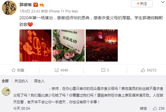 不过,也有网友吐槽郭德纲的专场门票真的贵,却也是有贵的原因,因为助演也都是大咖。更有网友还质问郭德纲只有自己的观众是衣食父母,其他演员的粉丝就不是衣食父母了吗?
