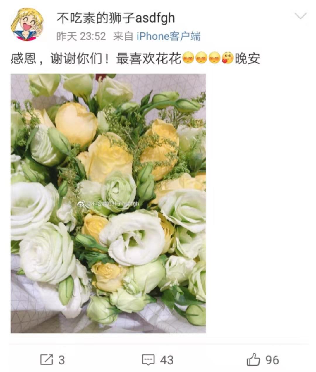 当晚,马蓉在某社交平台的小号晒出鲜花的照片并配文感恩粉丝们的关注:“感恩,谢谢你们!最喜欢花花,晚安。”粉丝回复道:“姐姐像花儿一样鲜艳!”
