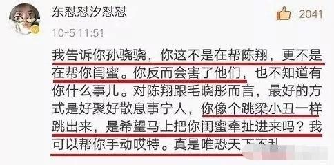 不仅不闭嘴,居然毫无情商地出面呵斥谴责江铠同的人,结果被毛晓彤朋友怼得不敢回复,间接坐实了江铠同插足陈翔毛晓彤恋情的传闻,网友都忍不住吐槽孙骁骁太蠢!