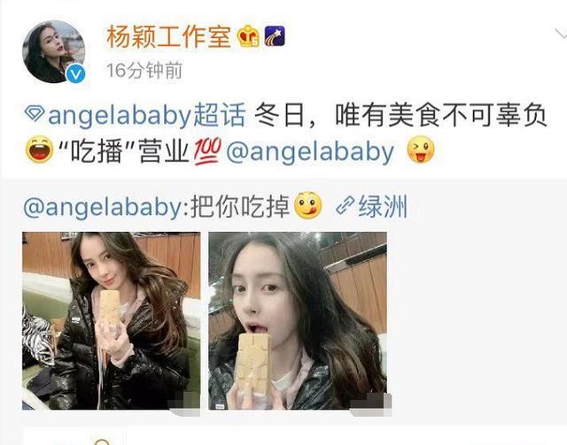 1月5日晚,杨颖在微博上分享了两张照片,只见她手中拿着食物,一副要吃掉的样子。她的工作室也更是一点也不含糊,直接说自己的老板开始了"吃播"营业。