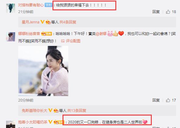 有不少网友留言评论,一些网友说道,“2020的又一口狗粮,在健身房也是二人世界啦”、“杰哥娜姐好甜!要一直幸福下去爱你们哟”、“我怀疑这是狗粮 但是我没有证据”,网友们纷纷开启调侃模式,祝福张杰夫妇幸福快乐,一直幸福下去。